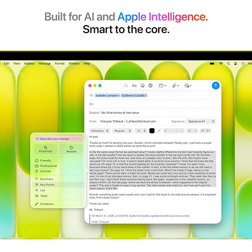 BUILT FOR AI—Apple silicon, and every major component that powers it, is designed to efficiently run on-device AI activities. And Apple Intelligence helps you write, express yourself, and get things done effortlessly with groundbreaking privacy protections at every step.
