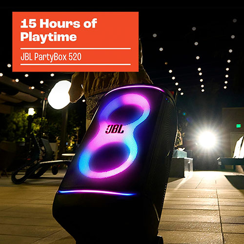 Got big plans that call for big sound? The JBL PartyBox 520 knows how to set the mood with a vibey lightshow and our biggest, boldest, thumping sound yet, powered by the all new AI Sound Boost tech to help get everyone moving and shaking. Our sound might be heavy but this speaker is easy to move, whether we’re setting up in the backyard, by the pool, or that place where our friend just dropped a pin. Every move is smooth with the PartyBox 520’s grippy handle and wide wheels that are ready to roll when you are. With up to 15 hours of playtime, you can host multiple parties before it’s time for a recharge. And don’t worry about any splashes or spills, this speaker is designed to withstand the most raucous parties – fouls and all. What’s better than one JBL PartyBox 520? Two or three or more! Pair them up or link with other JBL Auracast-enabled speakers and take the party up a notch.